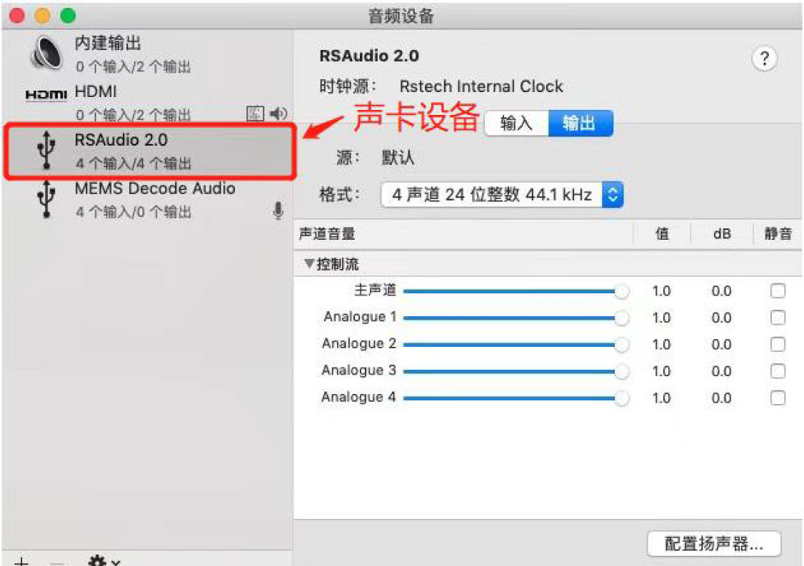 上图标识 1:Soundcheck 设别到的硬件名称,RSAudio 2.0 为声卡,MEMS Decoder Audio 为