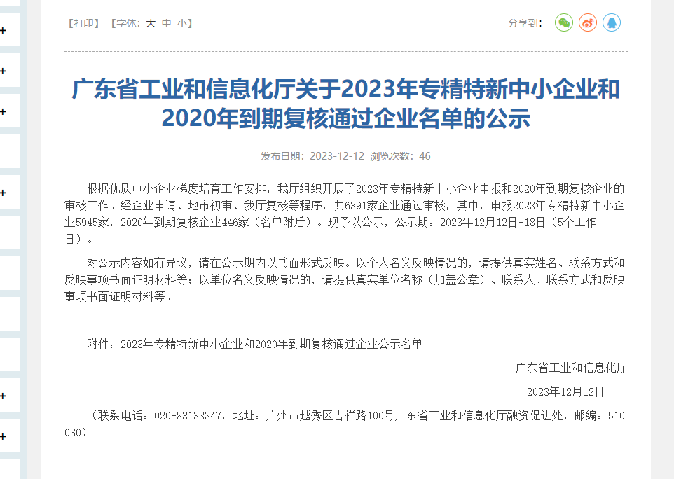 “专精特新”中小企业是广东省工业和信息化厅根据《广东省推动专精特新企业高质量发展的指导意见》等有关文件的要求设立的,旨在引导中小企业走“专业化、精细化、特色化、新颖化”发展之路,培育一批在细分行业内技术实力强、产品质量好、服务水平优、市场份额高、品牌影响大、发展前景广的中小企业。